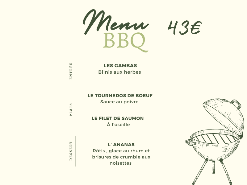 Pour combler toutes vos papilles, notre talentueux chef a élaboré un menu spécial BBQ , de l’entrée jusqu’au dessert. Chaque plat sera préparé avec soin et cuit au brasero pour garantir une cuisson parfaite.